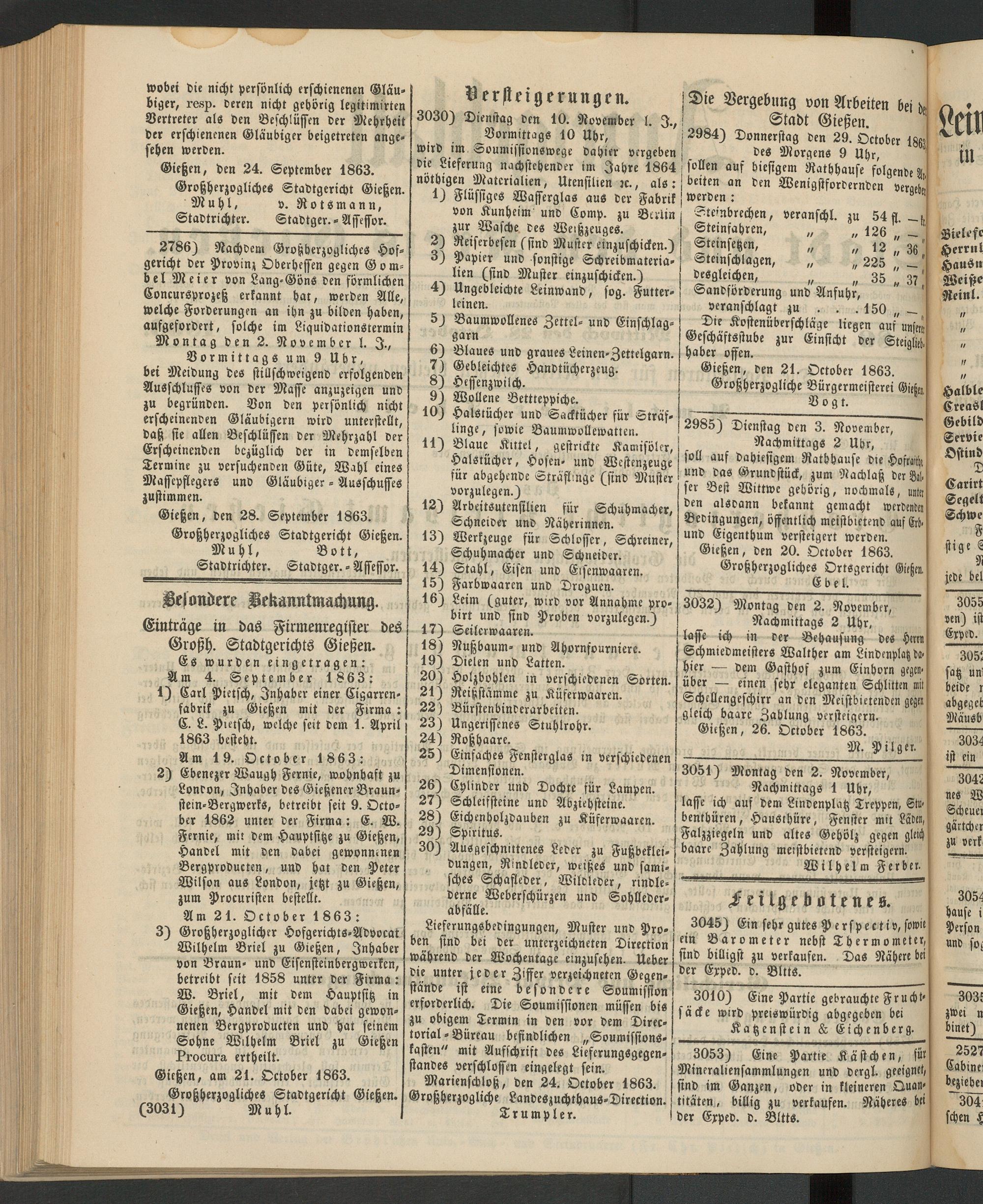 Gießen, 26. Oktober 1863. __________________ M. Pilger. 3051) Montag Den 2. November, Nachmittags 1 Uhr, lasse ich auf Dem LinDenplatz Treppen, SV benthüren, Hausthüre, Fenster mit Läden, Falzziegeln unD altes Gehölz gegen gleich, baare Zahlung metftbietenD versteigern.