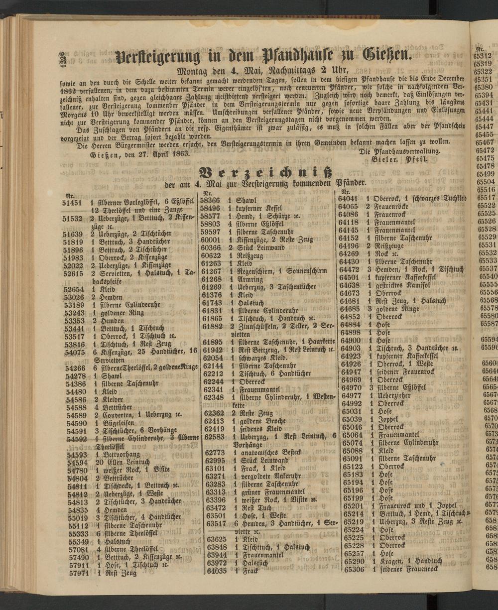 Gießen, den 27. April 1863. Die Pfandhausverwaltung.