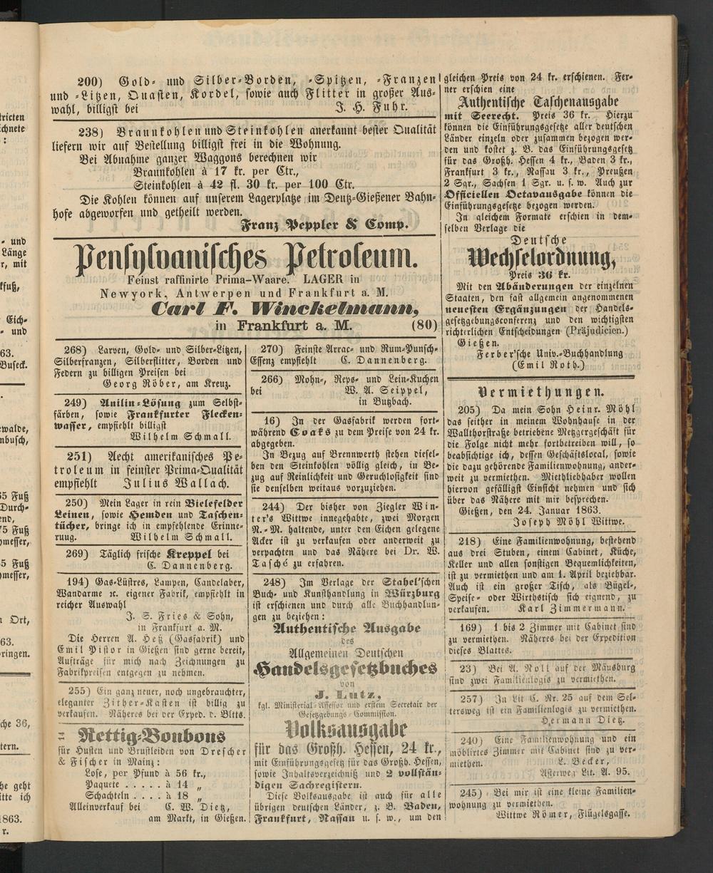 251) Aecht amerikanisches Petroleum in feinster Prima-Qualität empfiehlt Julius Wallach.