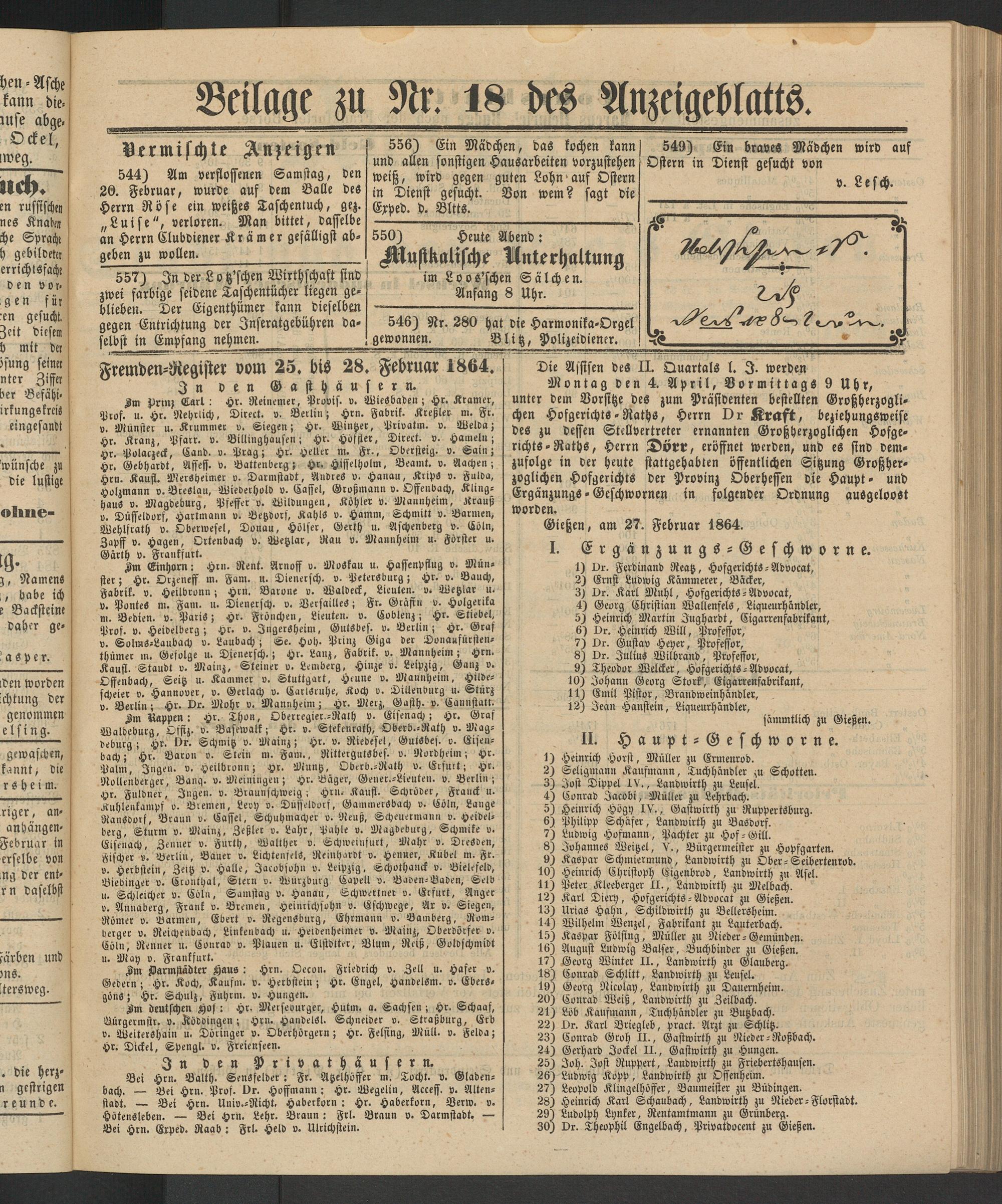 Im deutschen Hof: Hr. Mersevurger, Hutm. a. Sachsen; Hr. Schaaf, Bürgermstr. v. Köddingen; Hrn. Handelst. Schneider v. Straßburg, Erb v. Weitershain u. Düringer v. Oberhörgern; Hr. Felfing, Müll. v. Felda; Hr. Dickel, Spengl. «. Freienseen.