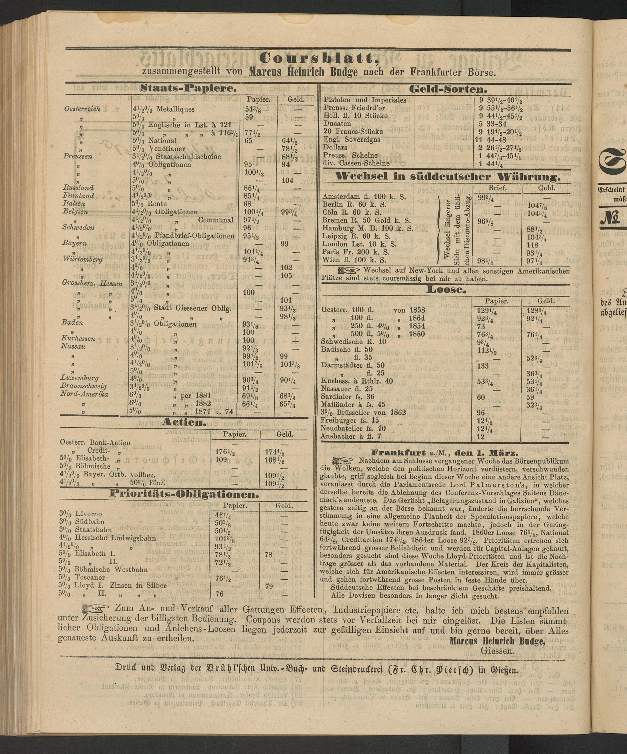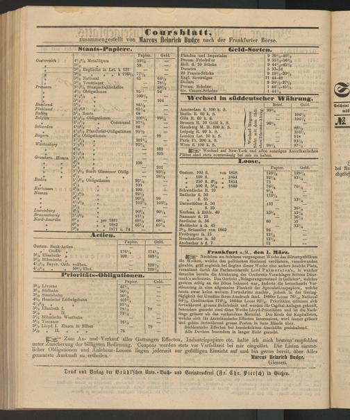 um An- und Verkauf aller Gattungen Effecten, Industriepapiere etc. halte ich mich bestens empfohlen unter Zusicherung der billigsten Bedienung. Coupons werden stets vor Verfallzeit bei mir eingelöst. Die Listen sämmt- licher Obligationen und Anlehens - Loosen liegen jederzeit zur gefälligen Einsicht auf und bin gerne bereit, über Alles genaueste Auskunft zu ertheilen. Mai'CUS Heinrich BudgC,