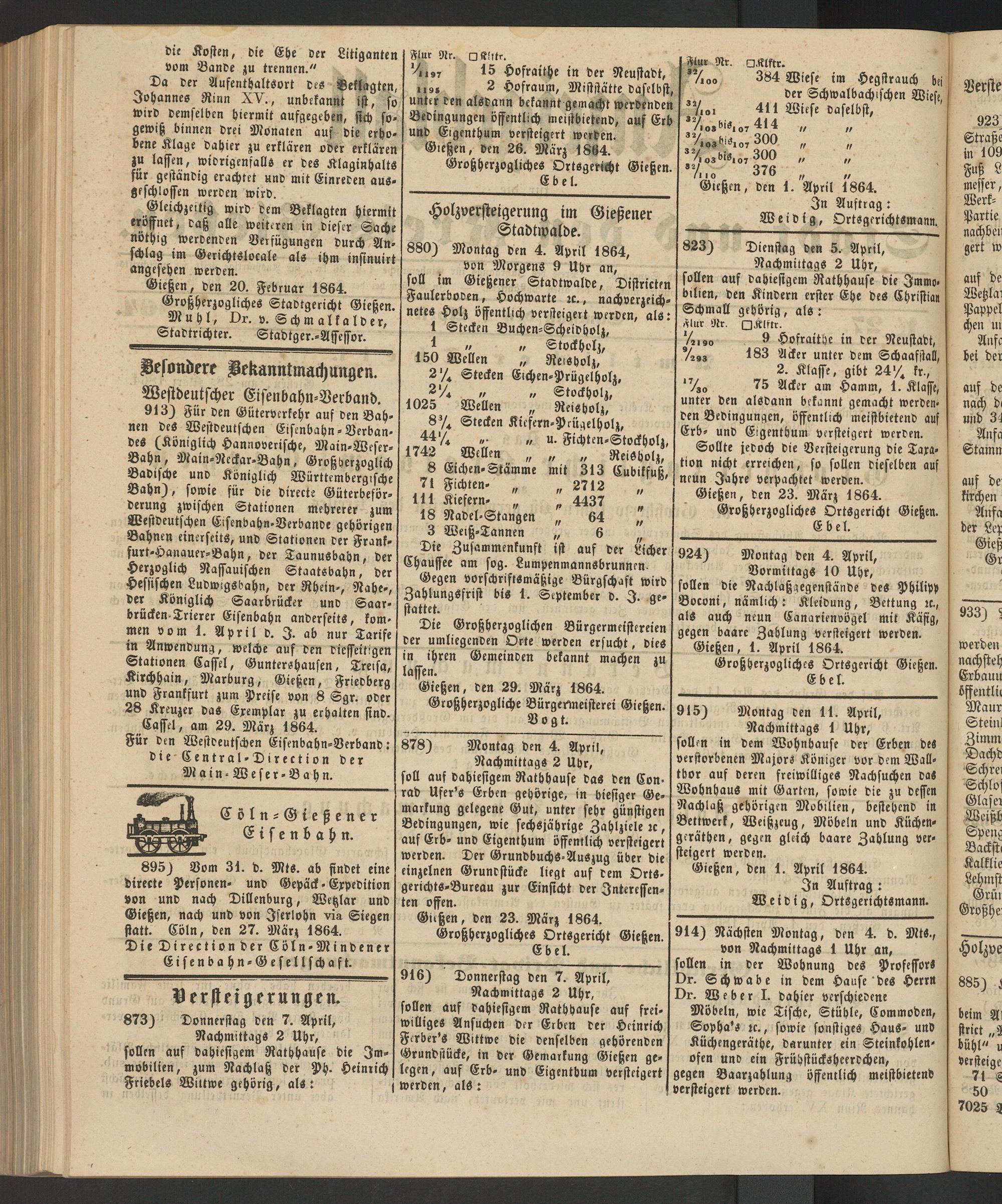 895) Vom 31. d. Mts. ab findet eine direkte Personen- und Gepäck-Expedition von und nach Dillenburg, Wetzlar und Gießen, nach und von Iserlohn via Siegen statt. Cöln, den 27. März 1864.
