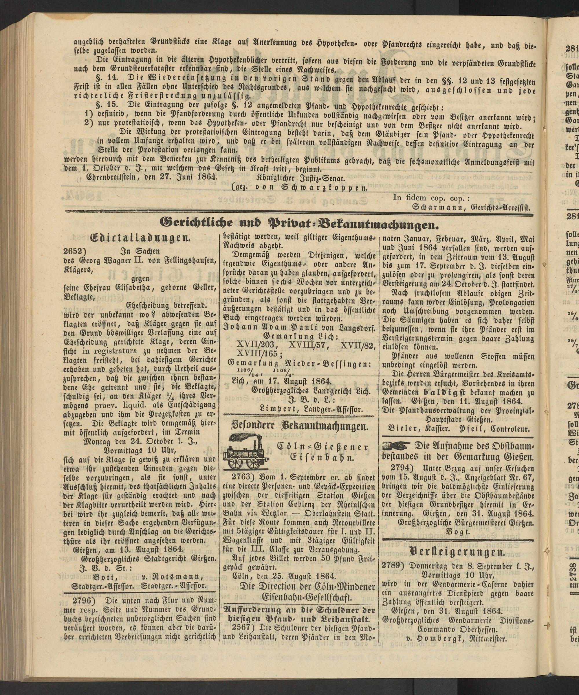 2763) Vom 1. September er. ab findet eine directe Personen- und Gepäck-Expedition zwischen der diesseitigen Station Gießen und der Station Coblenz der Rheinischen Bahn via Wetzlar — Oberlahnstein Statt. Für diese Route kommen auch Retourbillete mit 5tägiger Gültigkeitsdauer für I. und II. Wagenklasse und mit 3tägiger Gültigkeit für die III. Claffe zur Verausgabung.