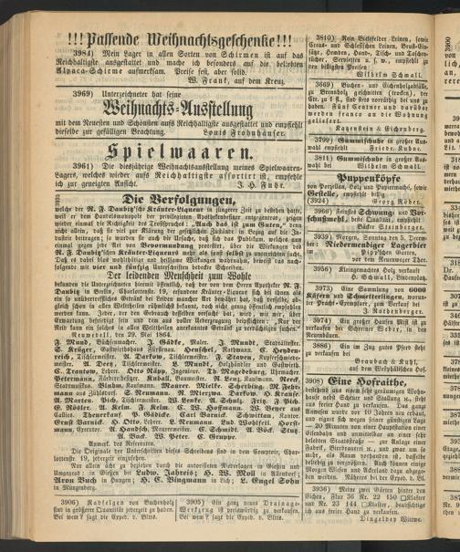 3961) Die diesjährige Weihnachtsausstellung meines Spielwaaren- Lagers, welches wieder aufs Reichhaltigste assortirt ist, empfehle ich zur geneigten Ansicht._____________________________I. H. Fuhr.