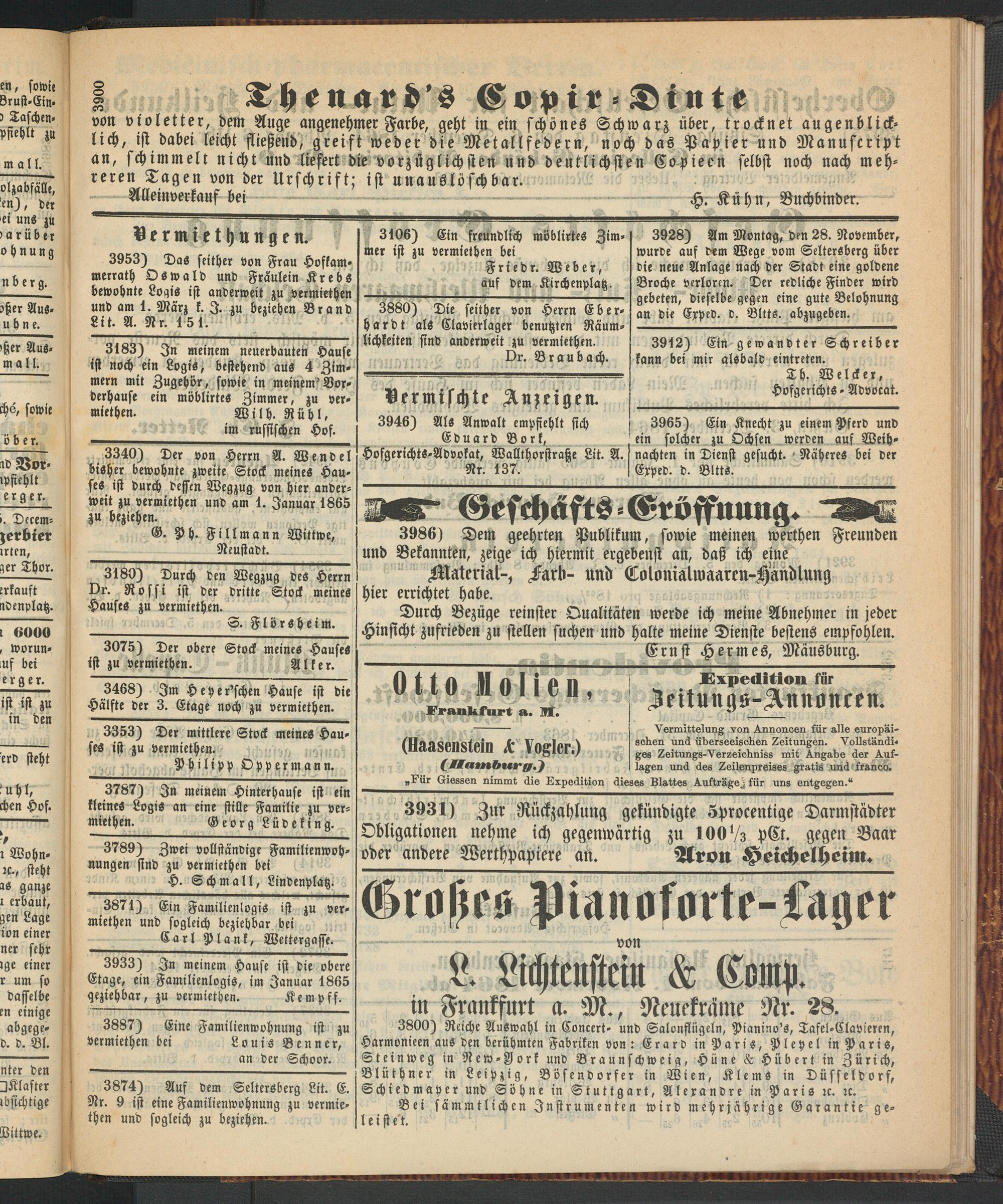 3880) Die seither von Herrn Eberhardt als Clavierlager benutzten Räumlichkeiten sind anderweit zu vermiethen.