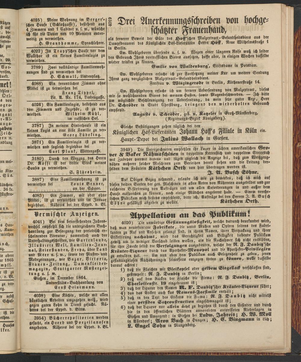 6) daß der Liqueur nur allein ächt zu beziehen ist durch den Erfinder und durch die in den öffentlichen Blättern annoneirten autonsirten N.edttlagen in Gießen und Umgegend: in Gießen bei Ludlv. JahrerS; H. 28. NtPÜ in Avendorf; Aron Buch in Hungen; H. C. Brngmann in dich; L. Engel Sohn in Munzenberg.
