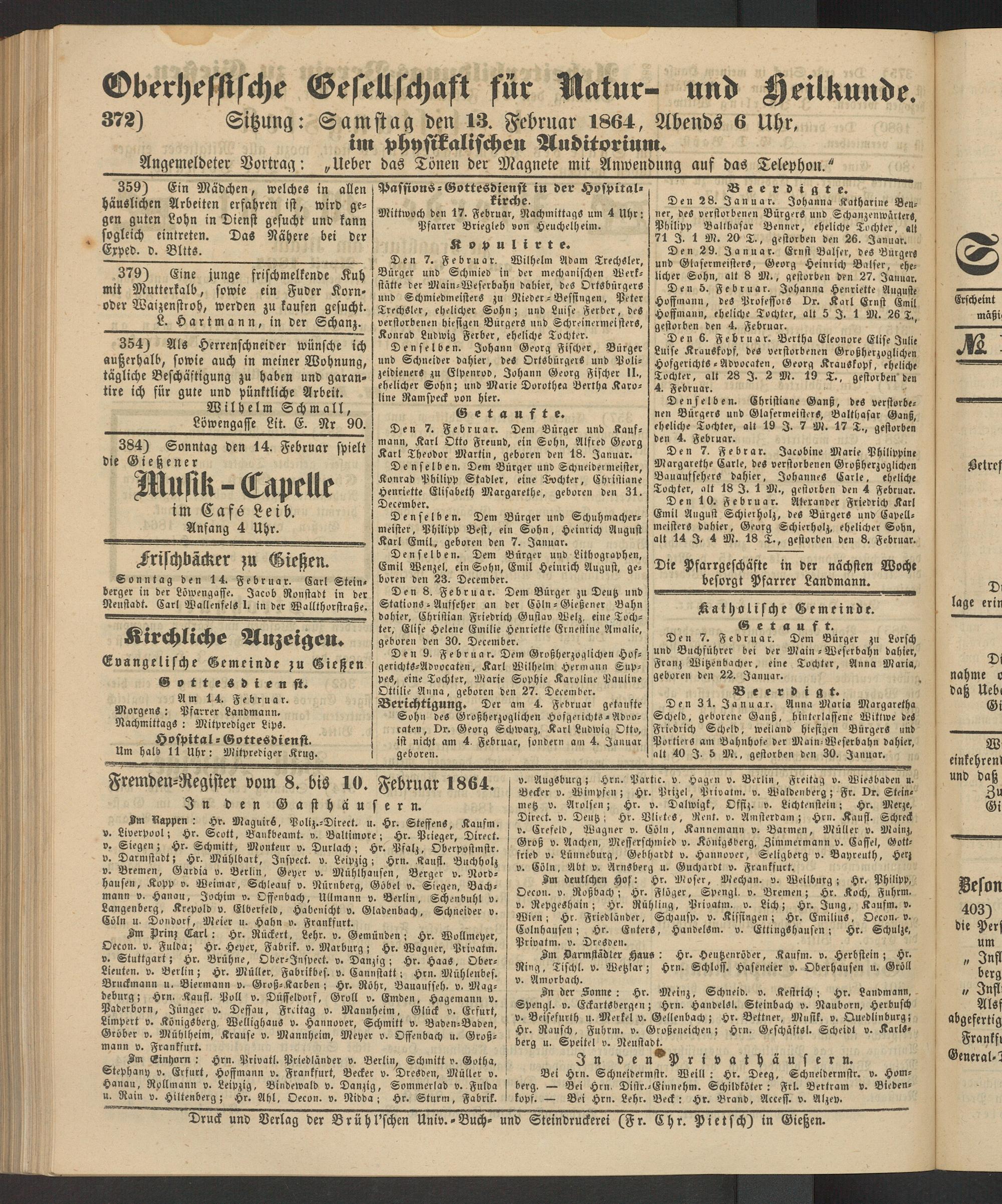 Im deutlchen Hof: Hr. Moser, Mechan. v. Weilburg; Hr. Philipp, Oecon. v. Roßbach; Hr. Flöger, Spengl. v. Bremen; Hr. Koch, Fuhrm. v. RepgeShain; Hr. Rühling, Privatm. v. Lich; Hr. Jung, Kaufm. v. Wien; Hr. Friedländer, Schaufp. v. Kiffingen; Hr. EmiliuS, Oecon. v. Colnhausen; Hr. Enters, HandelSm. v. Ettingshausen; Hr. Schulze, Privatm. v. Dresden.
