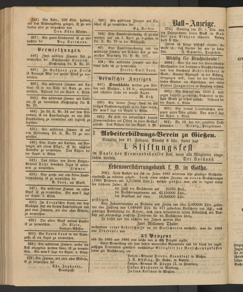 2994) Wer sich von der überraschenden Wirksamkeit des berühmten Bruchheilmittelr von dem Brucharzt Krüsi-Altherr in Gais, Kanton Appenzell in der Schweiz, überzeugen will, kann bei der Expedition dieses Blattes ein Schriftchen mit vielen Hundert Zeugnissen in Empfang nehmen.