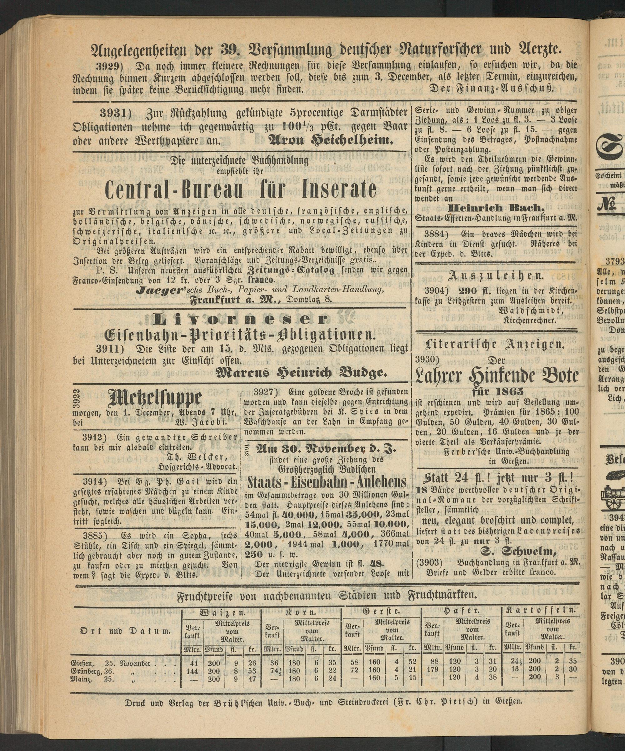 3931) Zur Rückzahlung gekündigte Sprocentige Darmstädter Obligationen nehme ich gegenwärtig zu 100Vs pCt. gegen Baar oder andere Werthpapiere an. Aron Heichelheim.
