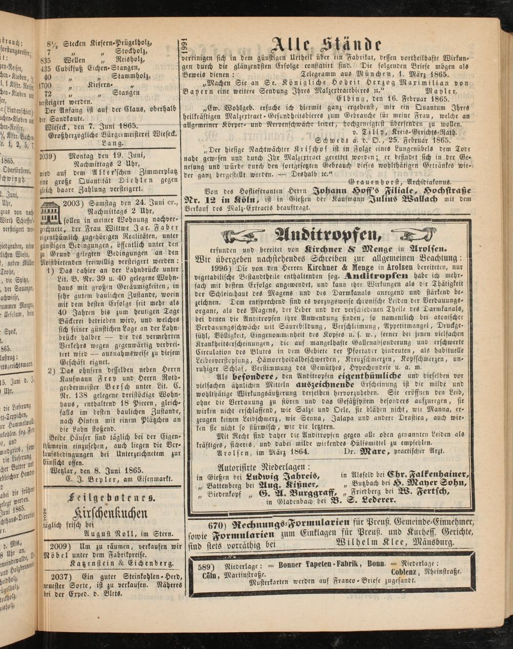Von des Hoflieferanten Herrn Johann Hoffs Filiale, Hochstraße Nr. 12 in Köln, ist in Gießen der Kaufmann Julius Wallach mit dem Verkauf des Malz-Extrakts beauftragt.