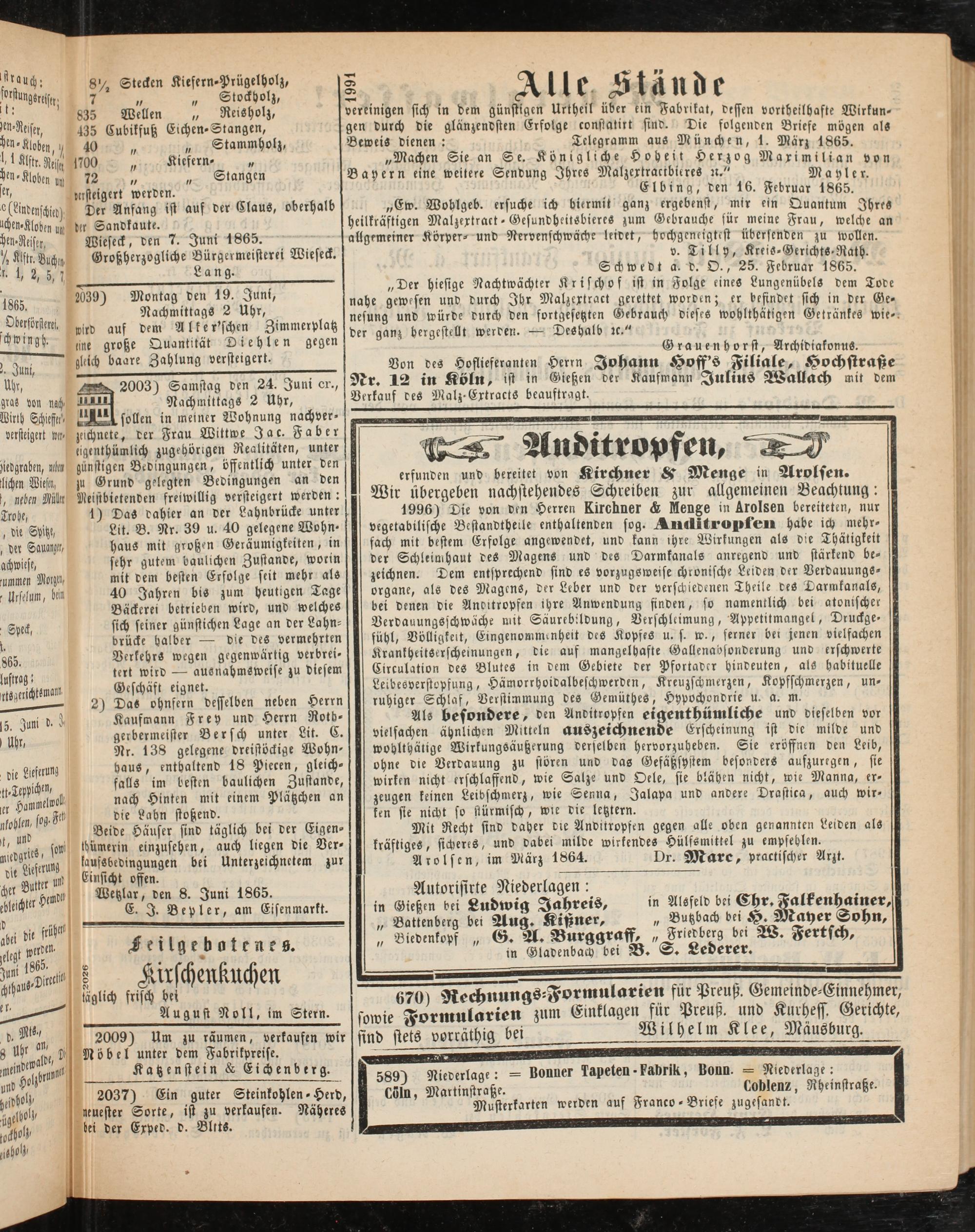 Gießen bei Ludwig Jahreis, in Alsfeld bei Chr. Falkenhainer, Battenberg be, Aug. Kißner, „ Butzbach be. H-Mayer Sohn, Biedenkopf „ G. A. Burggraff, „Friedberg be, W. Fertsch, in Gladenbach bei B. S. Lederer.