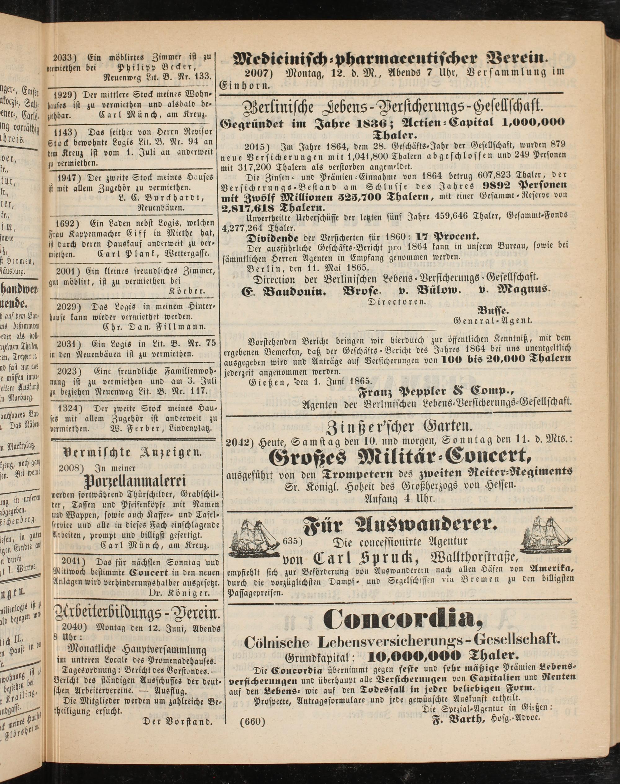 Die Concordia übernimmt gegen feste und sehr mäßige Prämien Lebensversicherungen und überhaupt alle Versicherungen von Capitalien und Renten auf den Lebens- wie auf den Todesfall in jeder beliebigen Form.