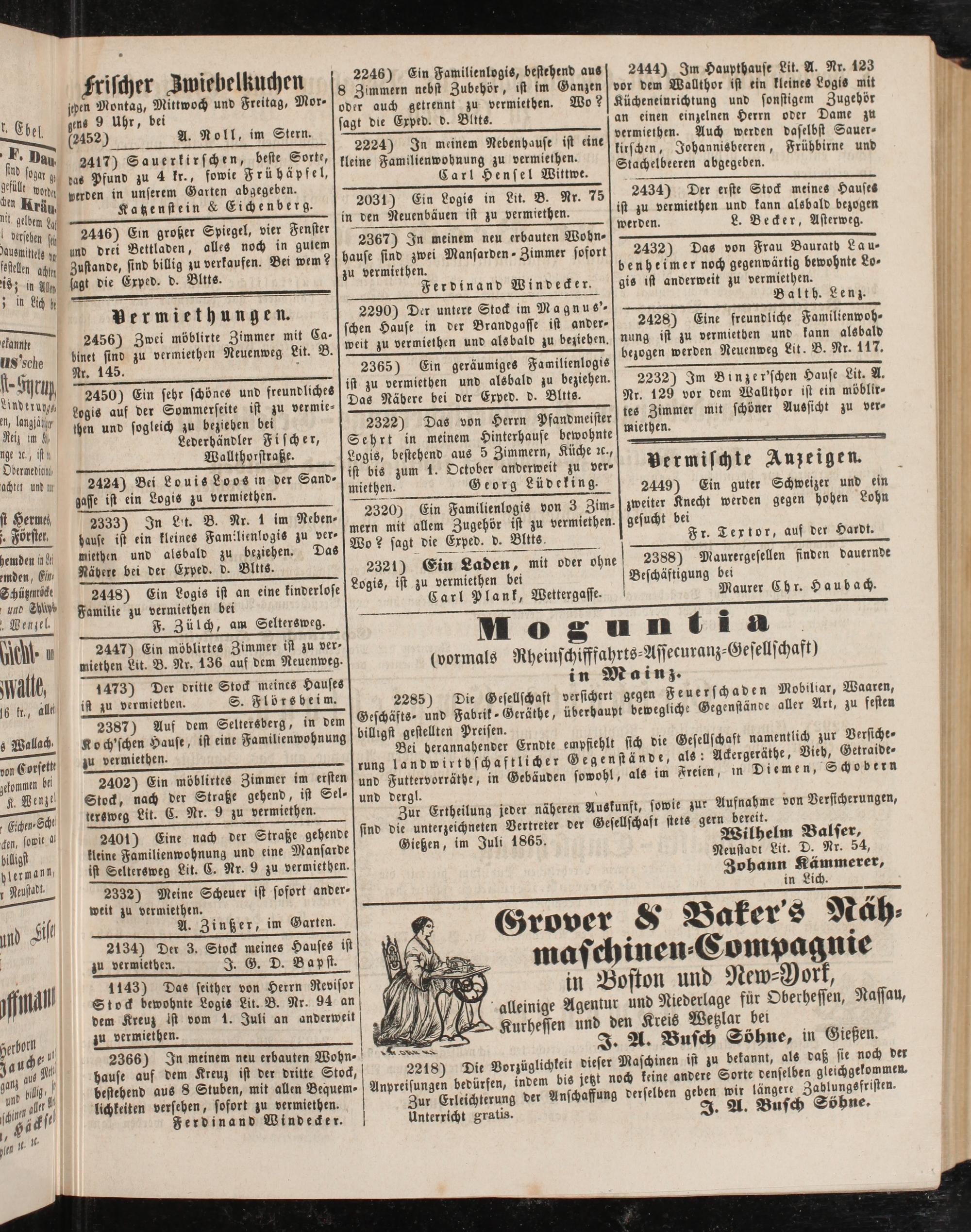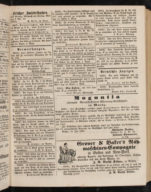 Grover SS Baker s Nähmaschinen Compagnie in Goston und New-Bork, alleiniae Agentur und Niederlage für Oberhessen, Nassau, Kurhessen und den Kreis Wetzlar bet W I. A Busch Sohne, in Gießen.