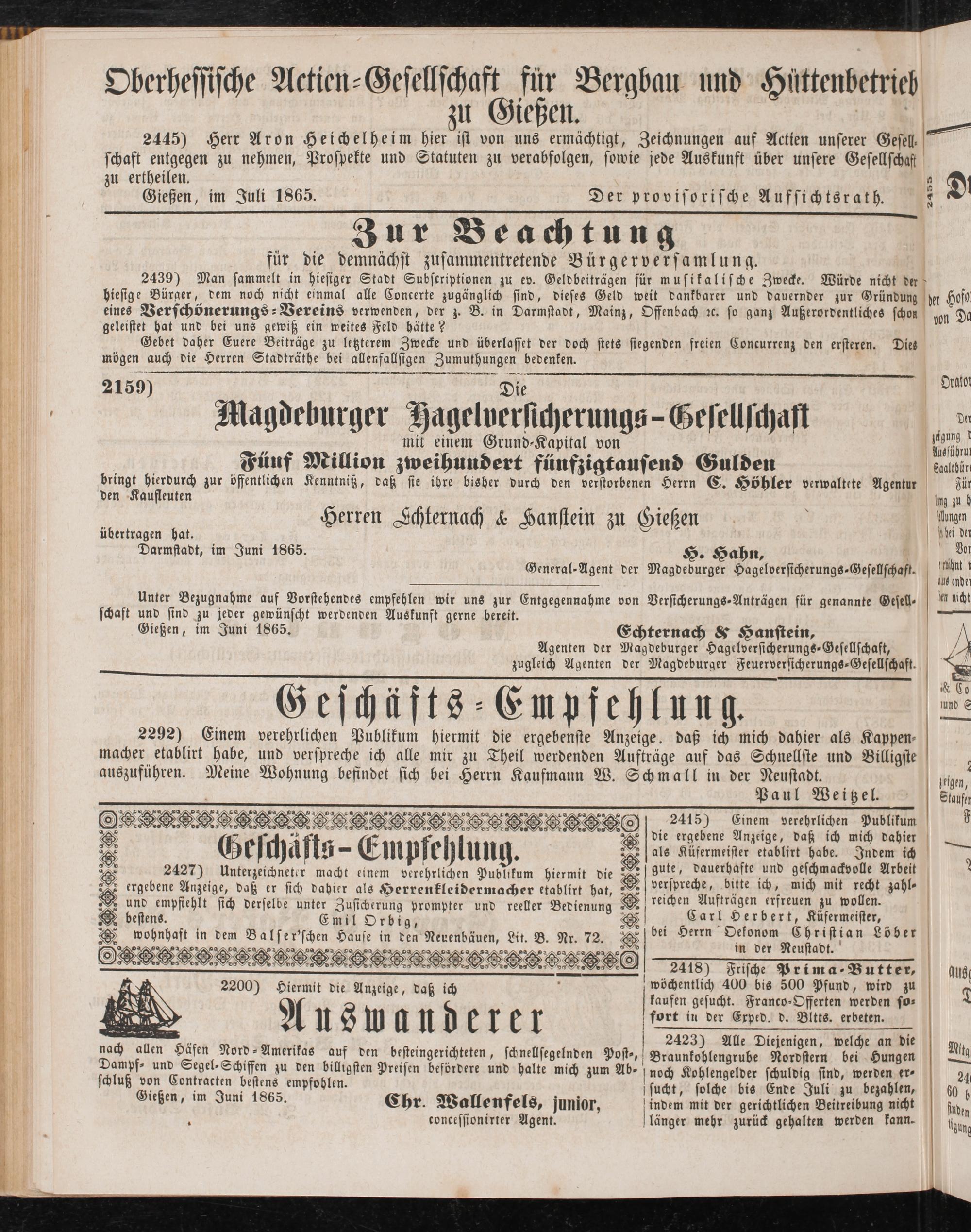2445) Herr Aron Heichelheim hier ist von uns ermächtigt, Zeichnungen auf Actien unserer Gesell- schäft entgegen zu nehmen, Prospekte und Statuten zu verabfolgen, sowie jede Auskunft über unsere Gesellschaft zu ertheilen. «