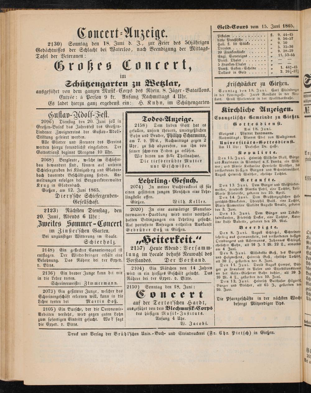 Den 15. Juni. Heinrich Wilhelm Moll, Bürg« und Kaufmann in AUendors a. lt. Lumda, ein Wittwer ; und Marie Katharine Henriette Walther, de» verstorbenen hi-stzen Burgers und Schrniebmeisters, August Heinrich Walther, eheliche Tochter.
