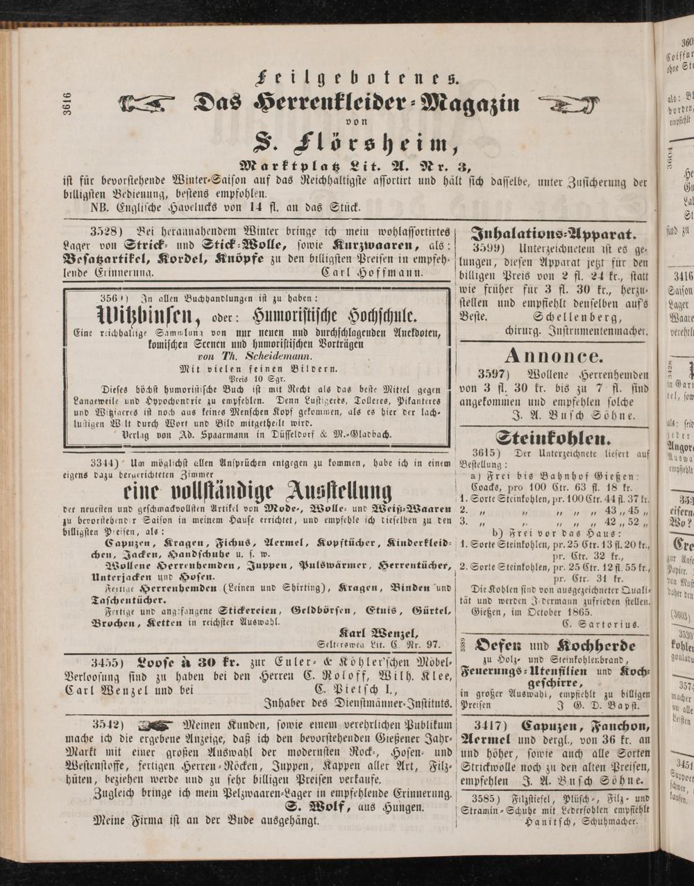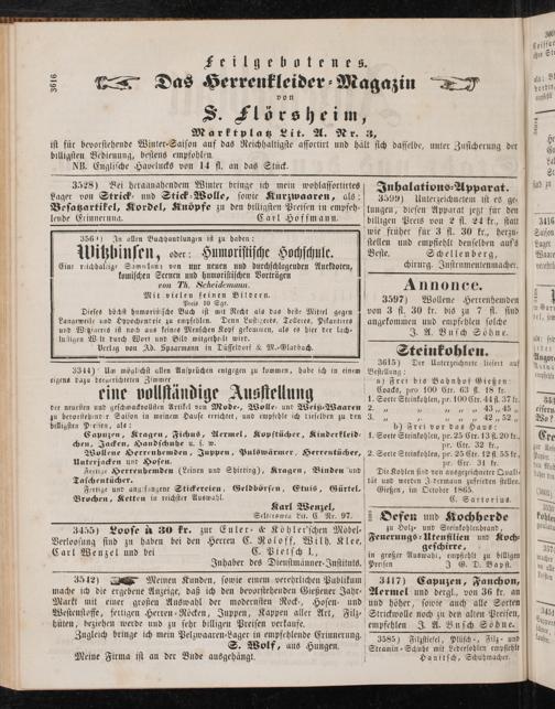 3528) Bei heraunahendem Winter bringe ich mein wohlassortirtes Lager von Strick- und Stick-Wolle, sowie Kurzwaaren, als: Befatzartikel, Kordel, Knöpfe zu den billigsten Preisen in empfehlende Erinnerung.Carl Hoffmann.