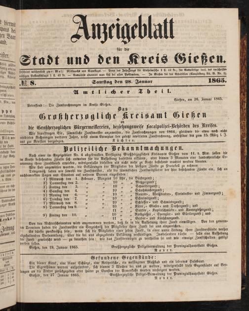 8 Gießen, den 27 Januar 1865. Großherzogliche Polizei-Verwaltung der Provinzialhauptstadt Gießen.