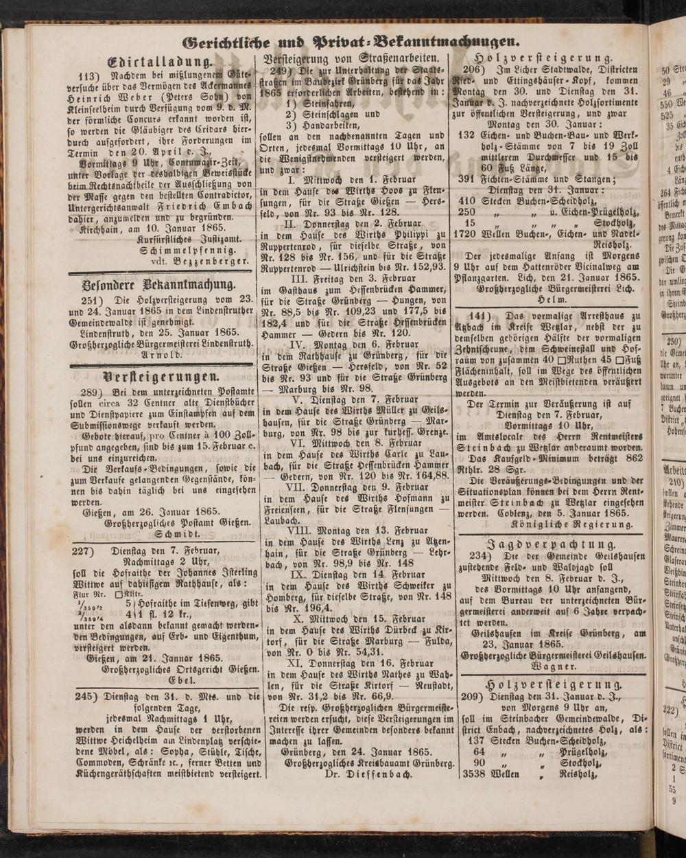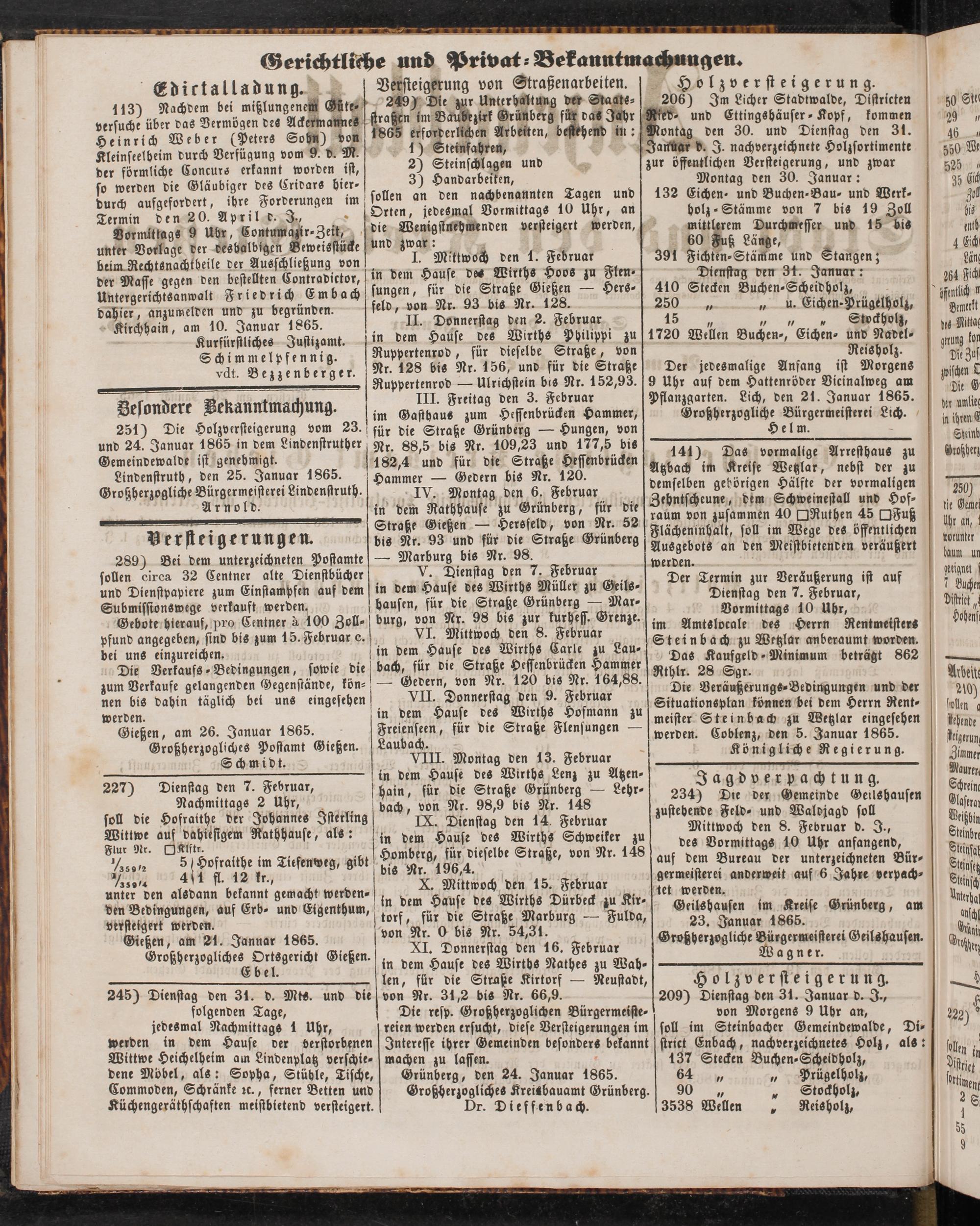 Der jedesmalige Anfang ist Morgens 9 Uhr auf dem Hattenröder Vicinalweg am Pflanzgarten. Lich, den 21. Januar 1865.