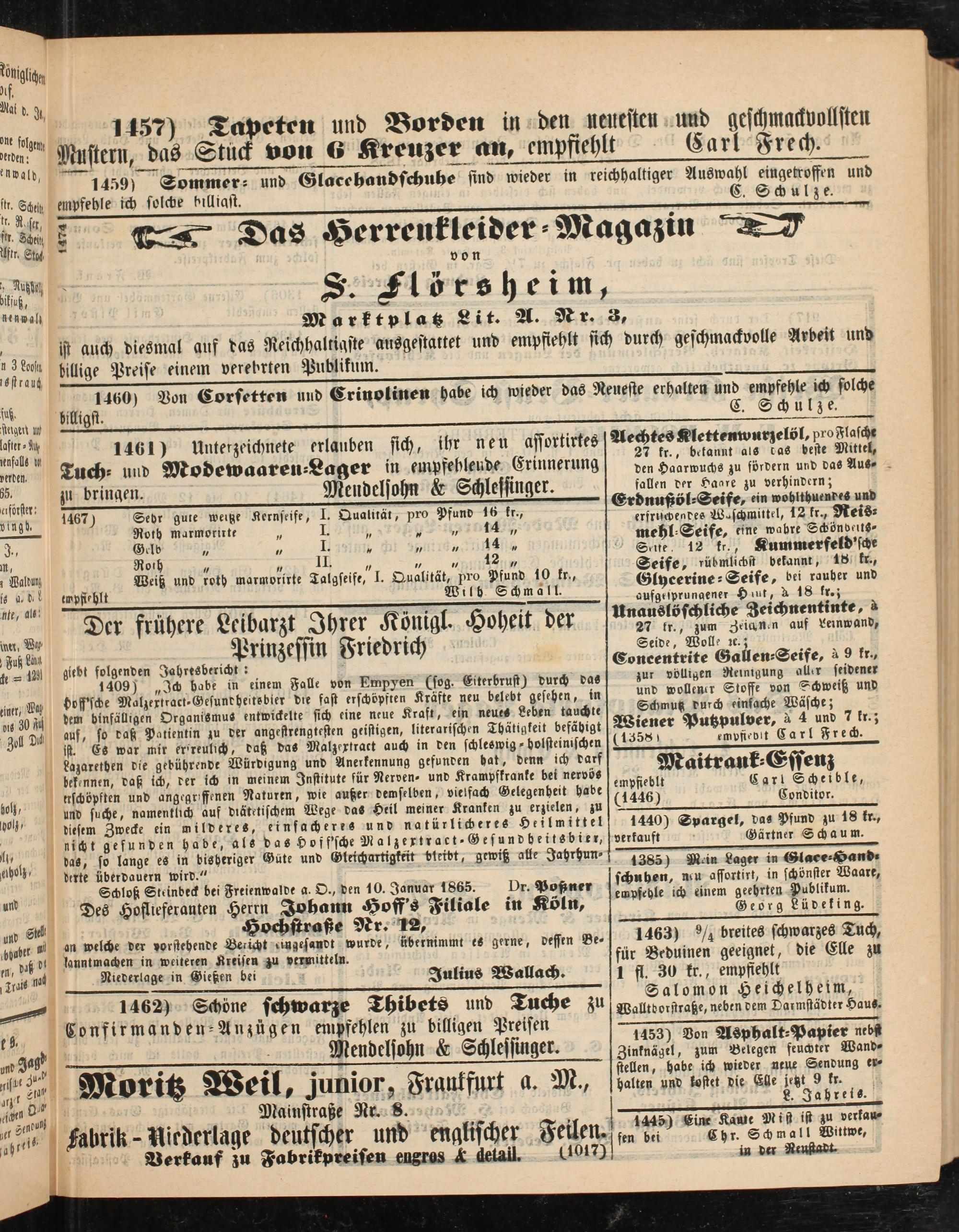 1461) Unterzeichnete erlauben sich, ibr neu affortirtes Tuch- und Modewaaren-Lager in empfehlende Erinnerung z„ bringen. Mendelsohn & Schlessmger.