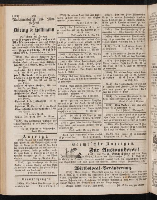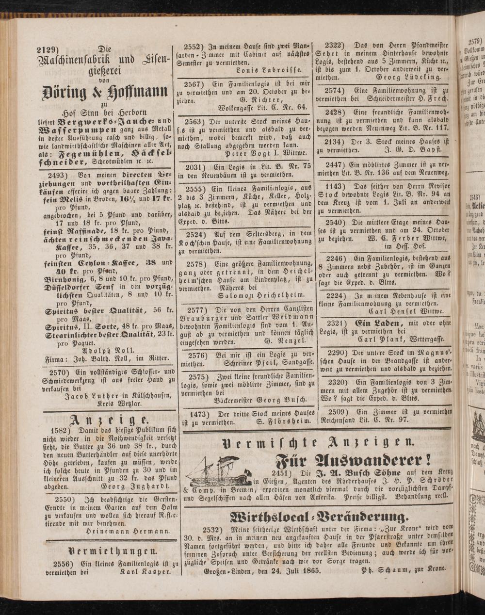 Großen-Linden, den 24. Juli 1865. PH. Schaum, zur Krone.