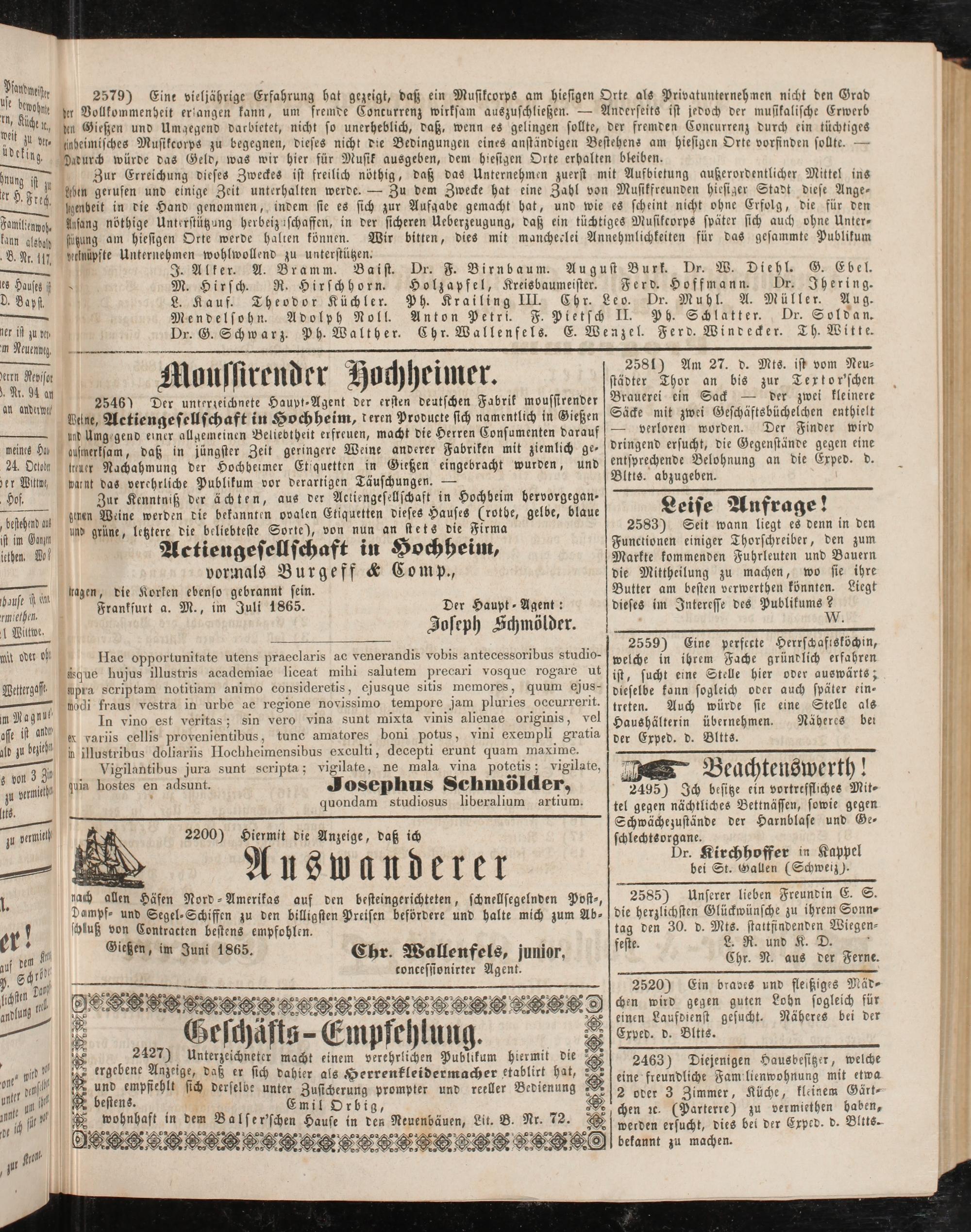 Gießen, im Juni 1865. Chr Wallenfels, junior,