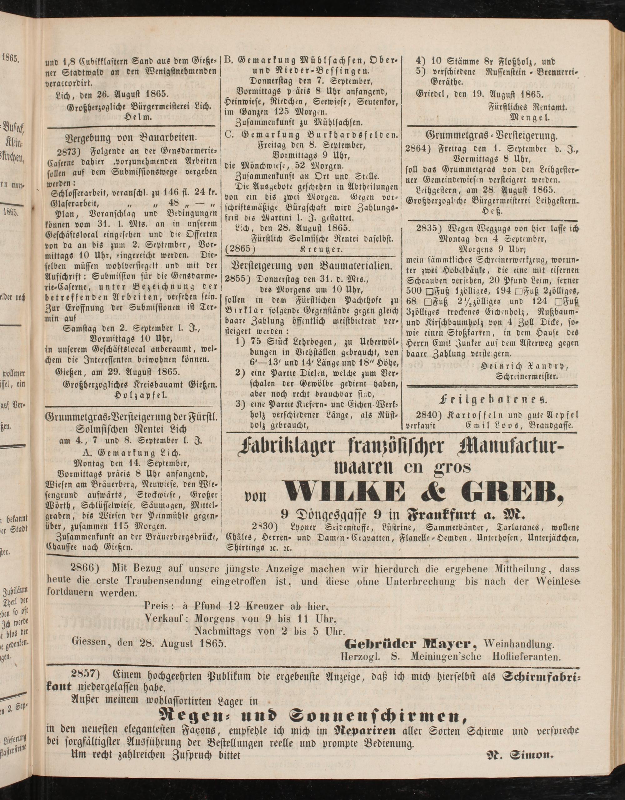 2866) Mit Bezug auf unsere jüngste Anzeige machen wir hierdurch die erg,ebene Mittheilung, dass heute die erste Traubensendung eingetroffen ist, und diese ohne Unterbrechung bis nach der Weinlese Fortdauern werden.