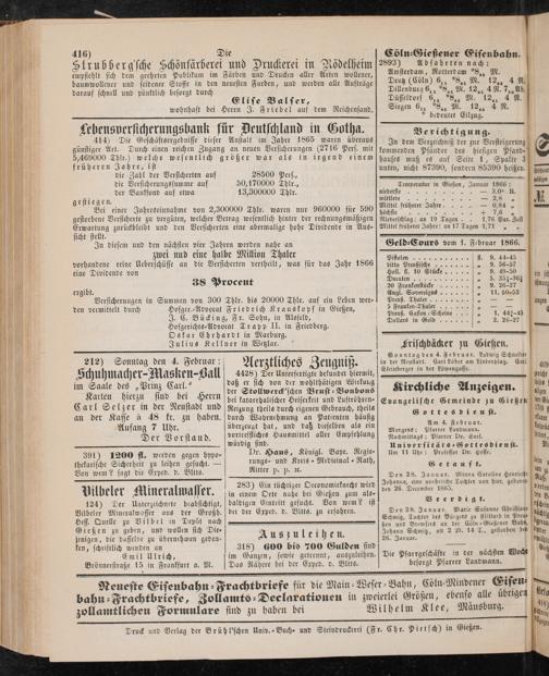 Versicherungen in Summen von 300 Thlr. bis 20000 Thlr. auf ein Leben werden vermittelt durch Hofger.-Advocat Friedrich Krauskopf in Gießen,