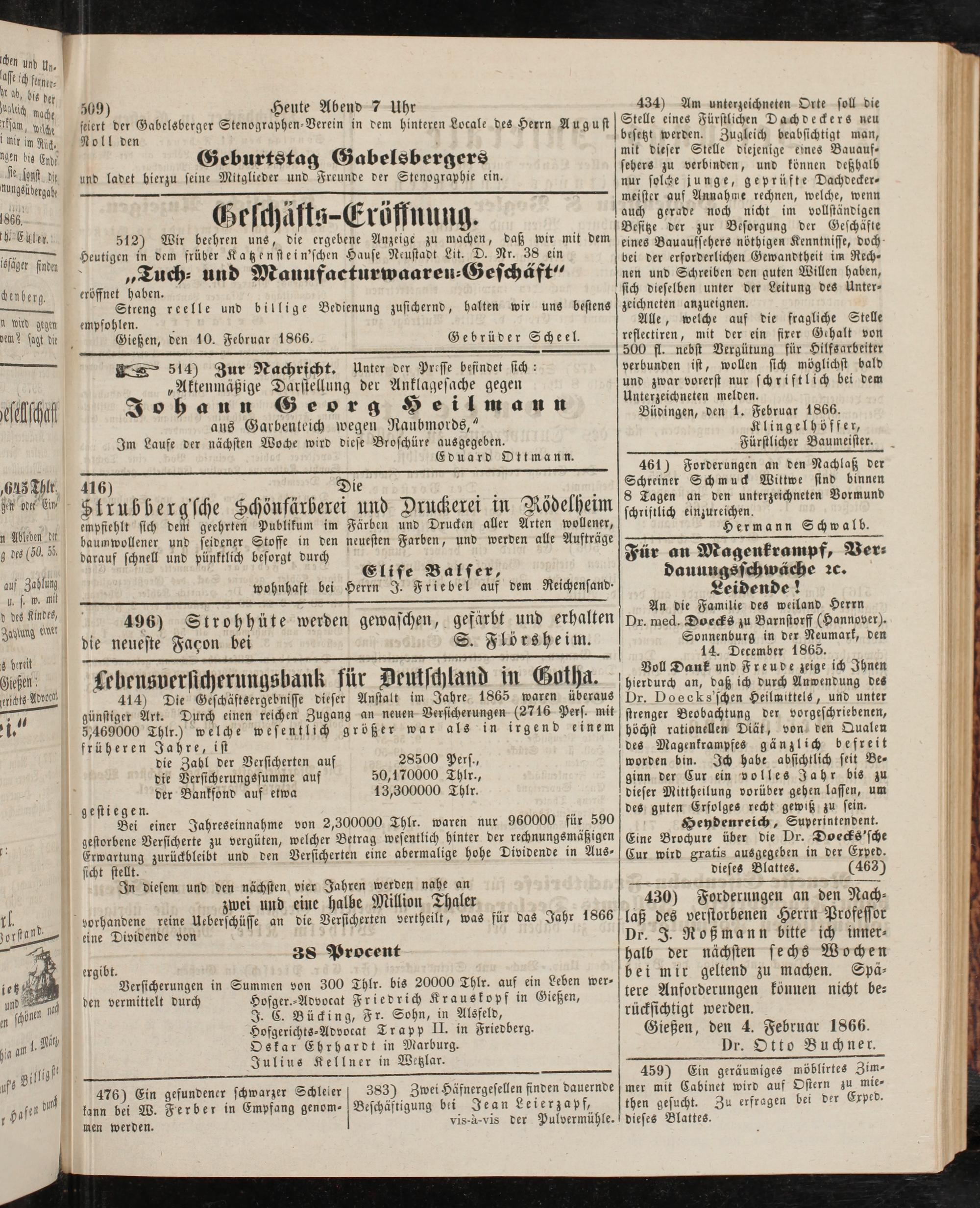 Versicherungen in Summen von 300 Thlr. bis 20000 Thlr. auf ein Leben werden vermittelt durch Hofger.-Abvocat Friedrich Krauskopf in Gießen,
