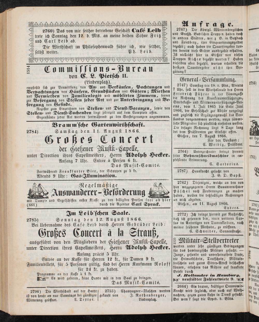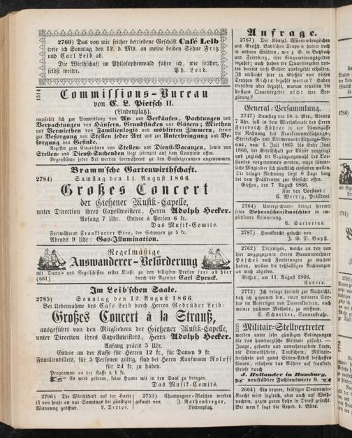 Großes Concert a la Strauß, ausgeführt von den Mitgliedern der Gießener Mustli-Kapelle, unter Direction ihres Capellmeisters, Herrn Adolph Hecker. Anfang präcis 5 Uhr.