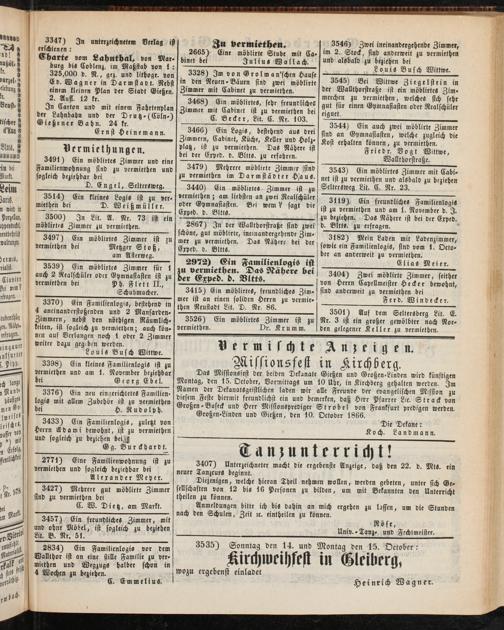 3404) Zwei möblirte Zimmer, seither von Herrn Capellmeister Hecker bewohnt, sind anderweit zu vermiethen bei