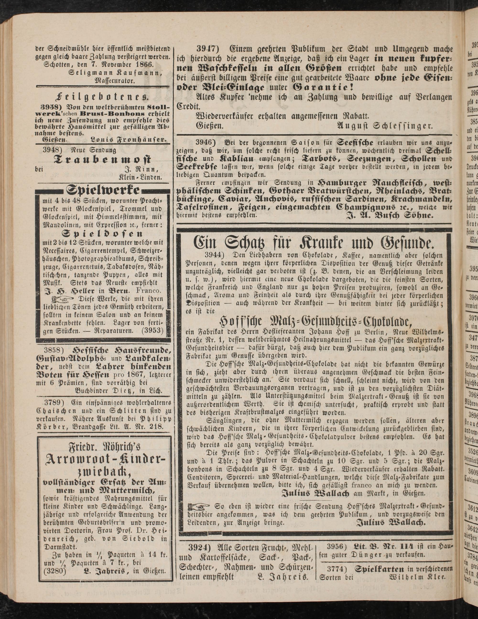 3858) Hessische Hausfreunde, Gustav-Adolphs- und Laudkalen- der, nebst dem Lahrer hinkenden Boten für Hessen pro 1867, letzterer mit 6 Prämien, sind vorräthig bei