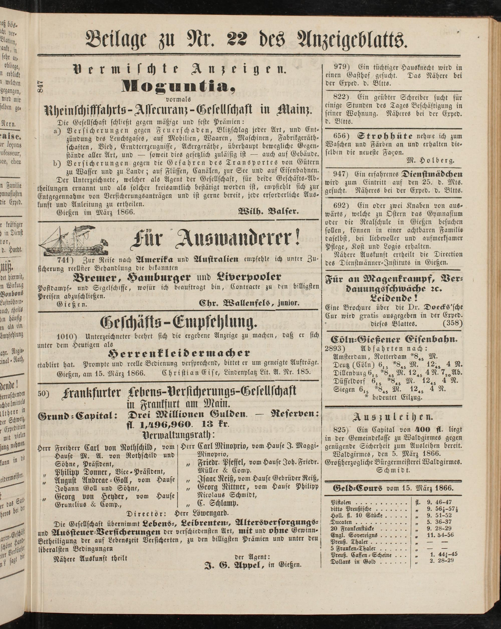 Gießen, am 15. März 1866. Christian Eise, Lindenplatz Lit. A. Nr. 185.