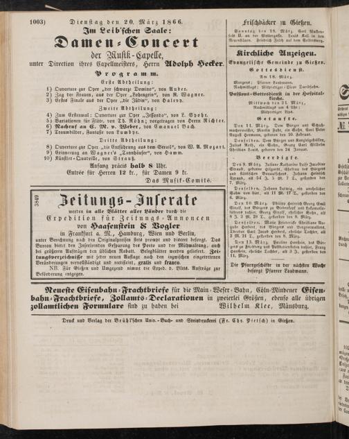 NB. Für Gießen und Umgegend nimmt die Exped. b. Bltts. Aufträge zur Beförderung entgegen.