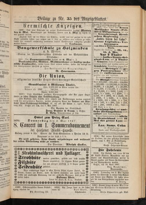 Jede Auskunft über dieselbe wird ertheilt und Versicherungen werden ermittelt durch den unterzeichneten Agenten, welcher gleichzeitig Agent der Aachener und Münchener Feucr-Vcrsicherungs-Gesellschaft ist, die mit der Union in engster Serbin- düng steht. Gießen und dich, den 1. Mai 1867.