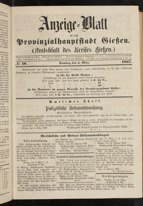 Gießen, den 22. Februar 1867. Großherzogliches Stadtgericht Gießen.