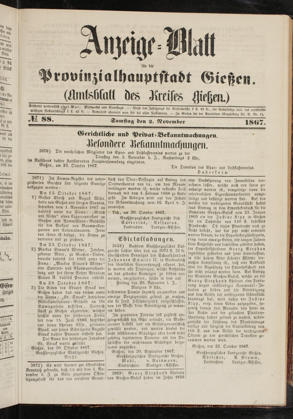 Gießen, den 30. Oktober 1867. Großherzogliches Stadtgericht Gießen. Muhl.