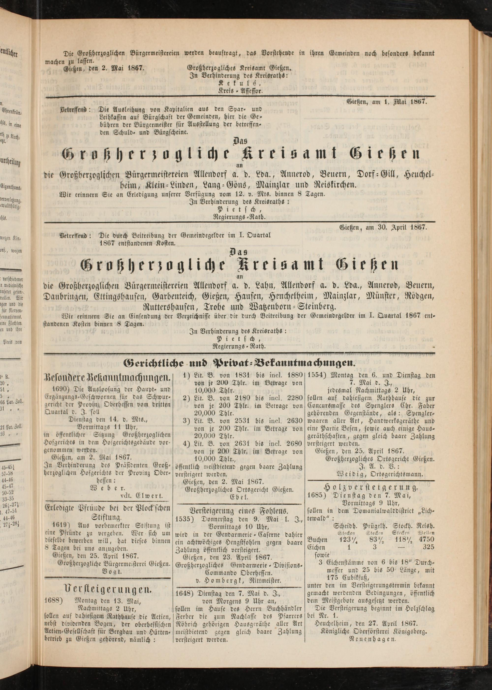 Güßen, den 2. Mai 1867. Großherzogliches KreiSamt Gießen.