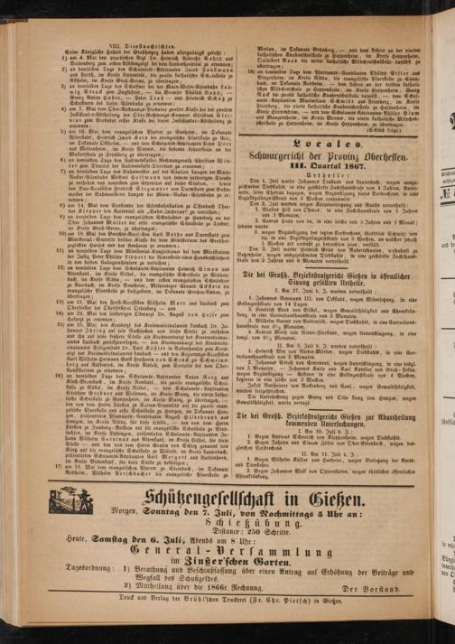 IDen 1. Juli wurde Johanne« Traband au« Lauterbach, wegen ausgezeichneten Diebstahl«, in eine geschärfte Zuchthausstrafe von 4 Jahren, Anlotnette, feine Ehefrau dagegen, wegen Begünstigung dieses Berbrechen«. in eine Bezirksgefängnißstrafe von 3 Wochen condemnirt.