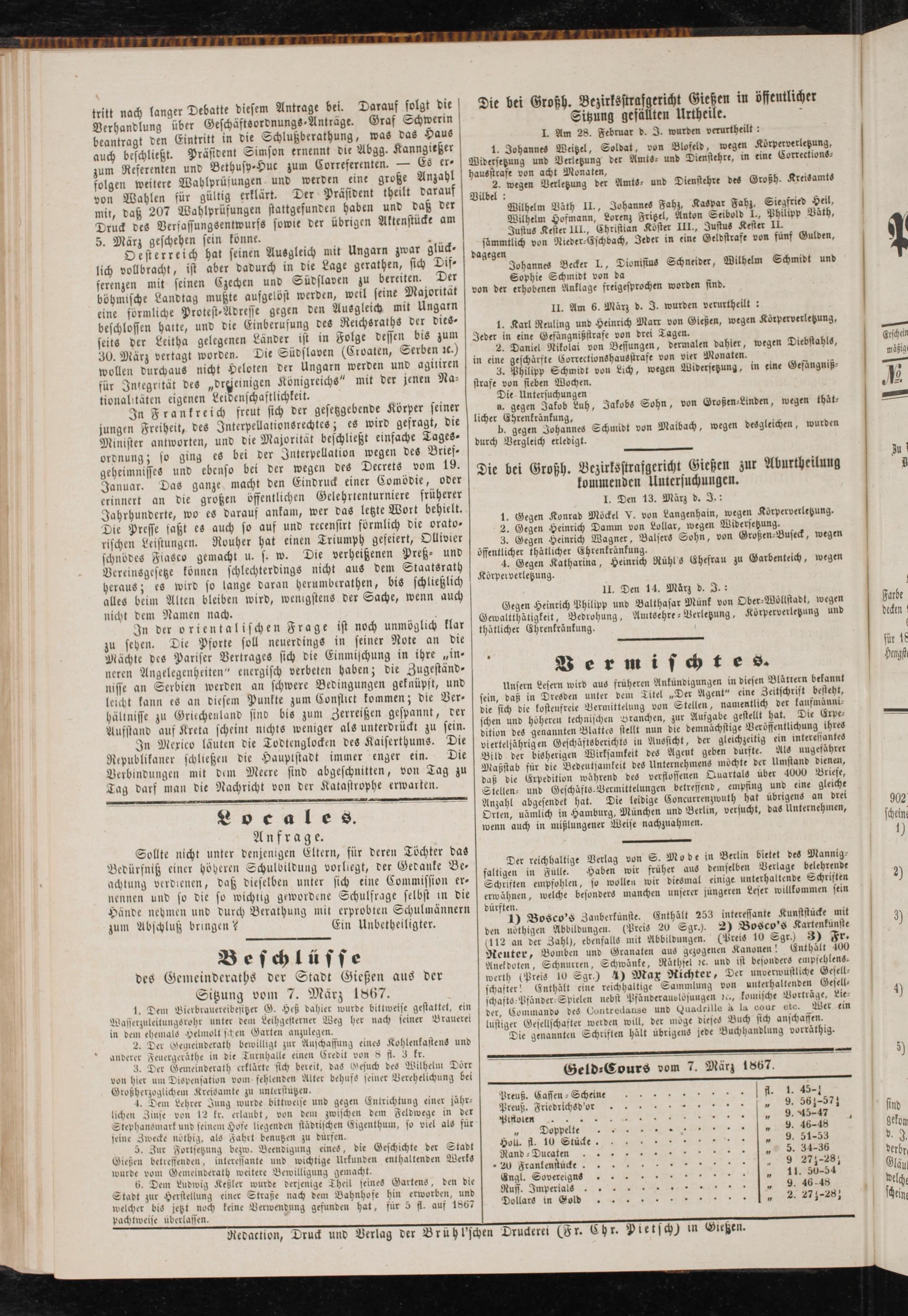 des Gcmeindcraths der Stadt Äicßen aus der Sitzung vorn 7. März 1867.