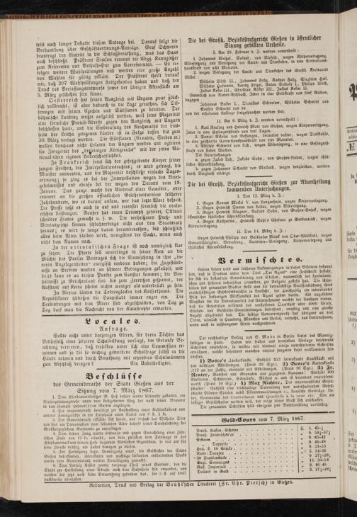 Redaktion, Druck unv Vertag ter Lrühl'schen Druckerei (Fr. Ehr. Pietsch) in Gießen.