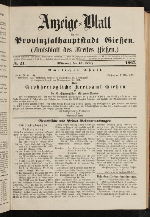 Gießen, am 2. Januar 1867. Großherzogliches Landgericht Gießen.