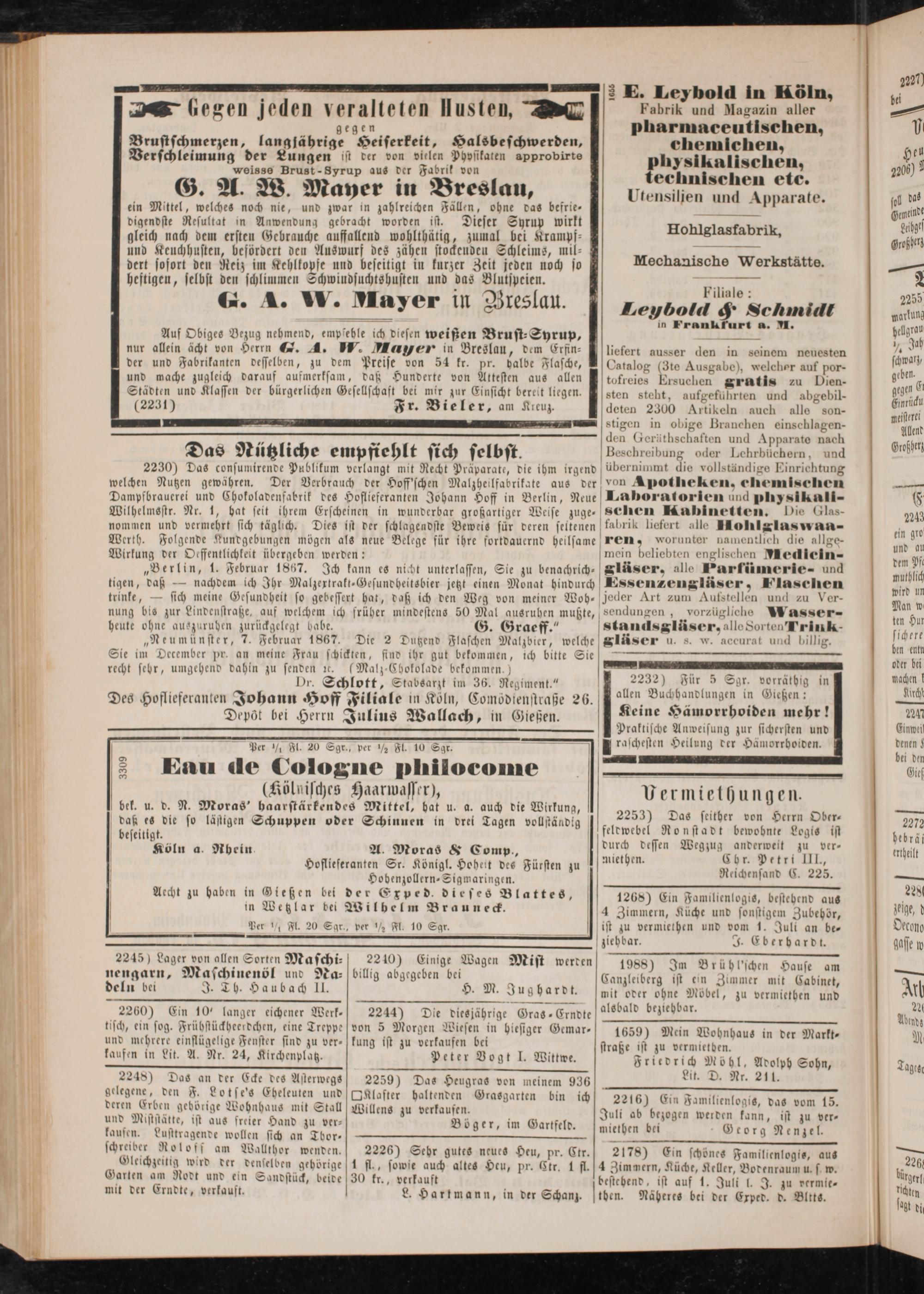 Des Hoflieferanten Johann .Hoff Filiale in Köln, Coinodienstraße 26. Depot bei Herrn Julins Wallach, in Gießen.