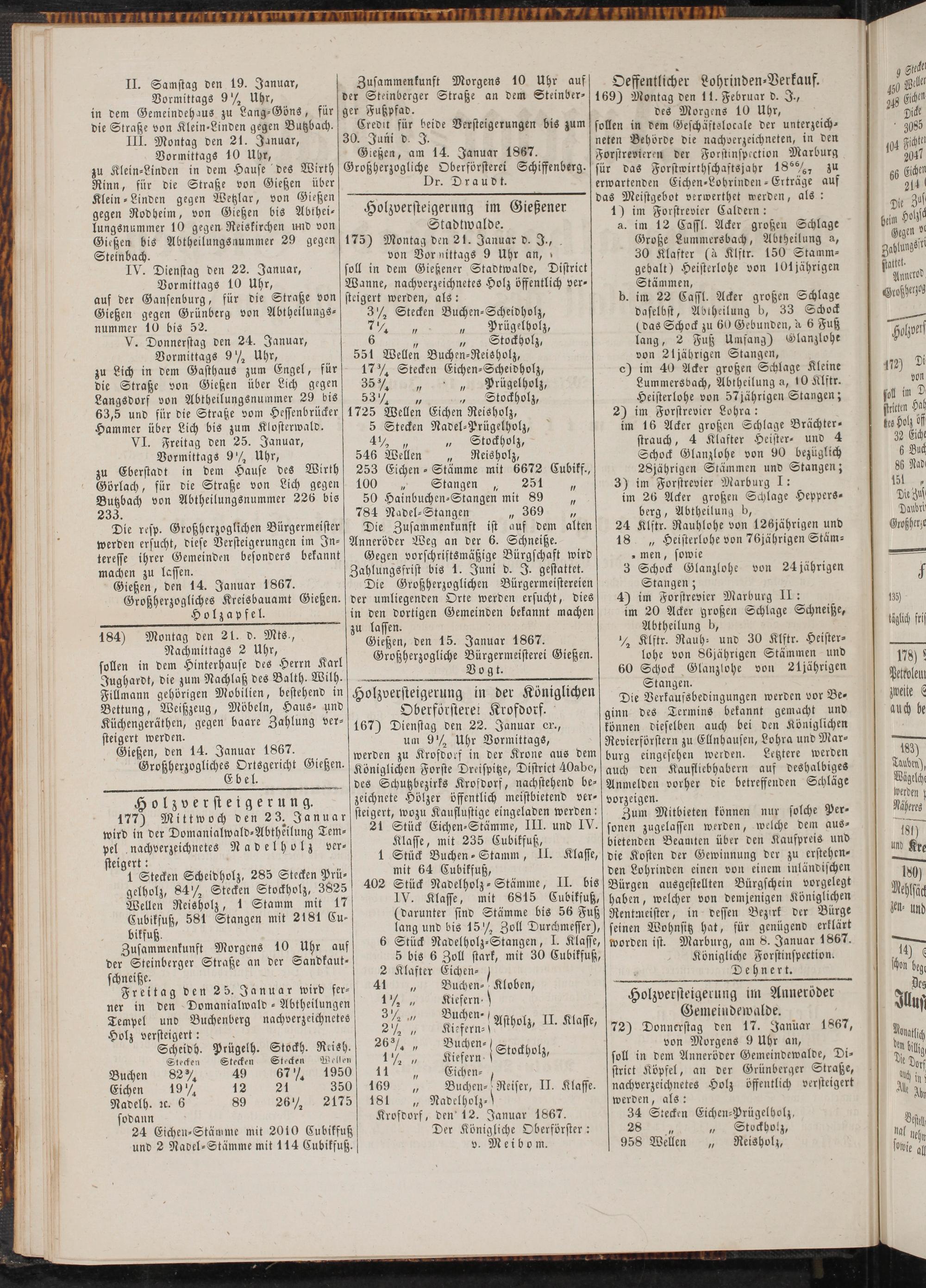 Gießen, am 14. Januar 1867. Großherzogliche Oberförsterei Schiffenberg.