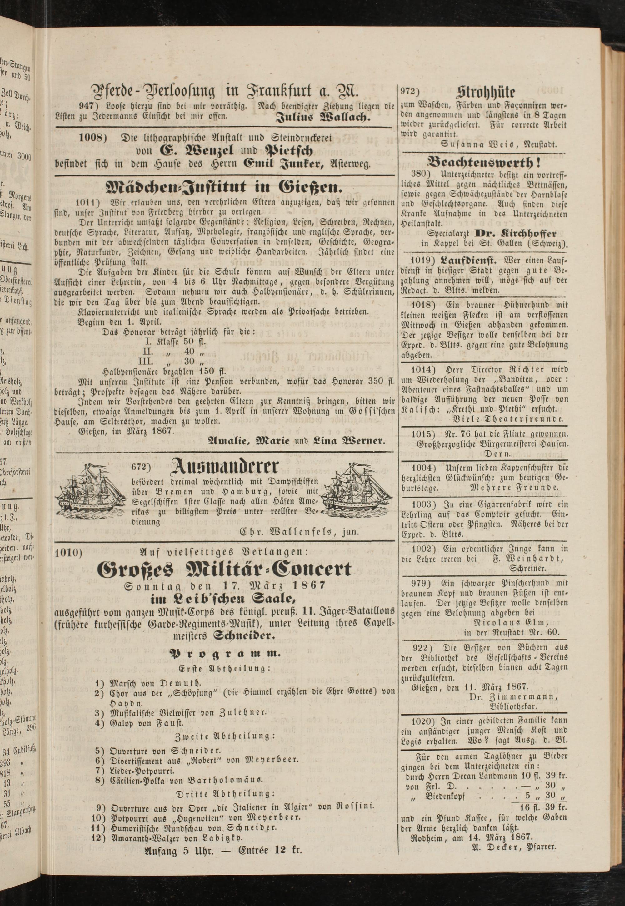 1011) Wir erlauben uns, ven verchrlichcn Eltern anzuzeigen, daß wir gesonnen sind, unser Institut von Friedberg hierher zu verlegen.
