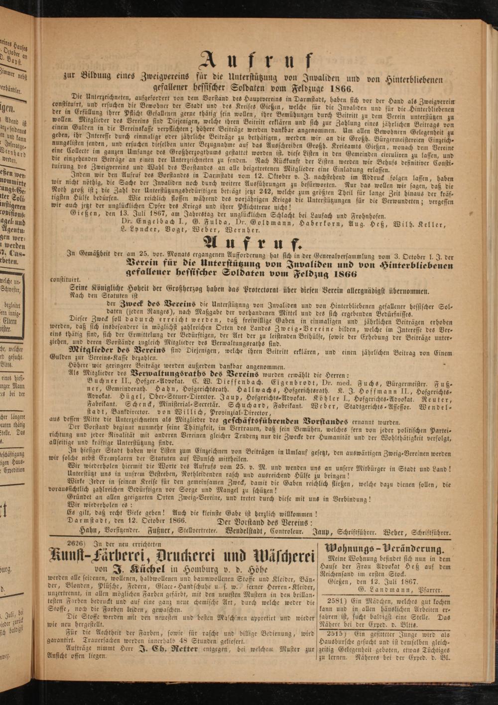 zur Bildung eines ZweigvereinS für die Unterstützung von Invaliden und von Hinterbliebenen gefallener hessischer Soldaten vom Feldzuge 1866.