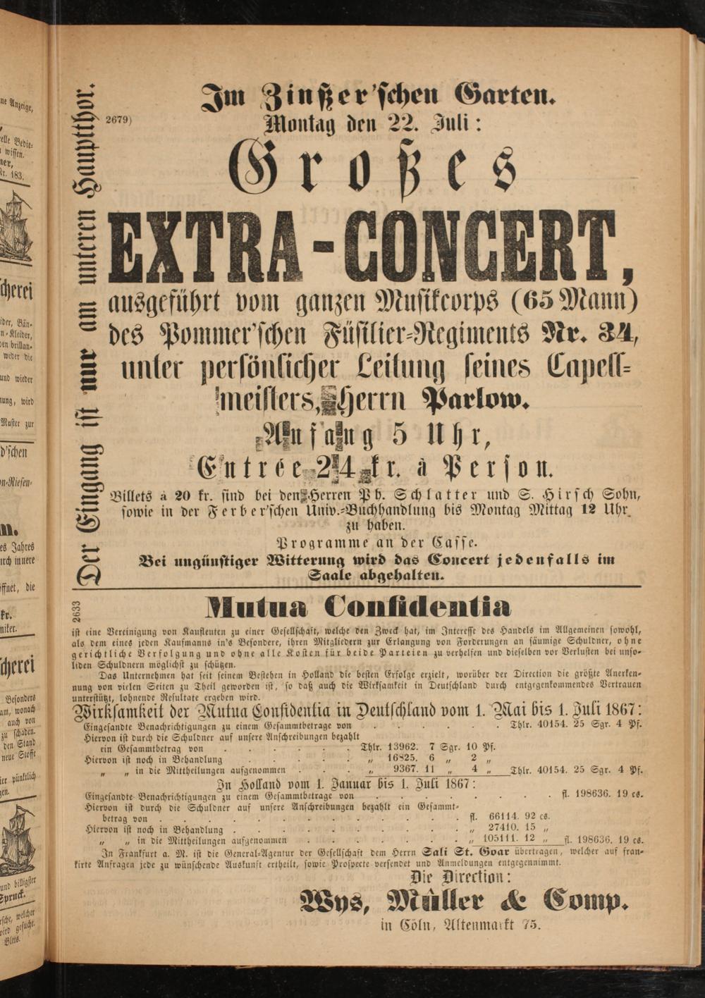 Wirksamkeit der Mutua Konstdentia in Deutschland vom 1. War brs 1. Jun 1867 : Eingesandte Benachrichtigungen zu einem Gesammtbetrage von Thlr. 40154. 25 Sgr. 4 Pf. Hiervon ist durch die Schuldner auf unsere Anschreibungen bezahlt