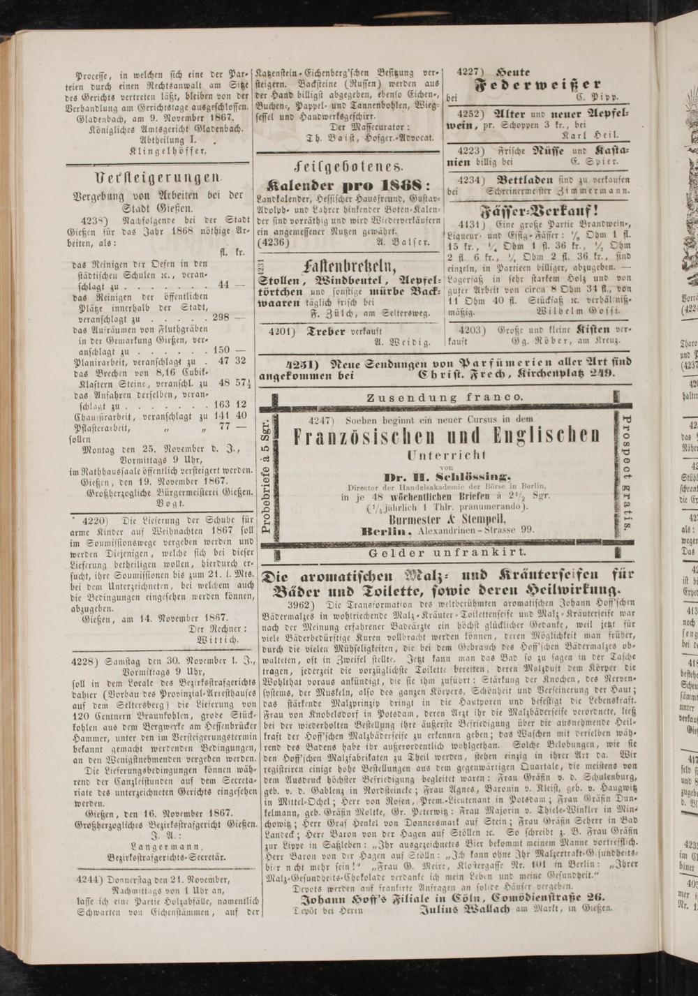 im Nathhnussaaie öffentlich versteigert werden.1 Giessen, den 19. November 1867.