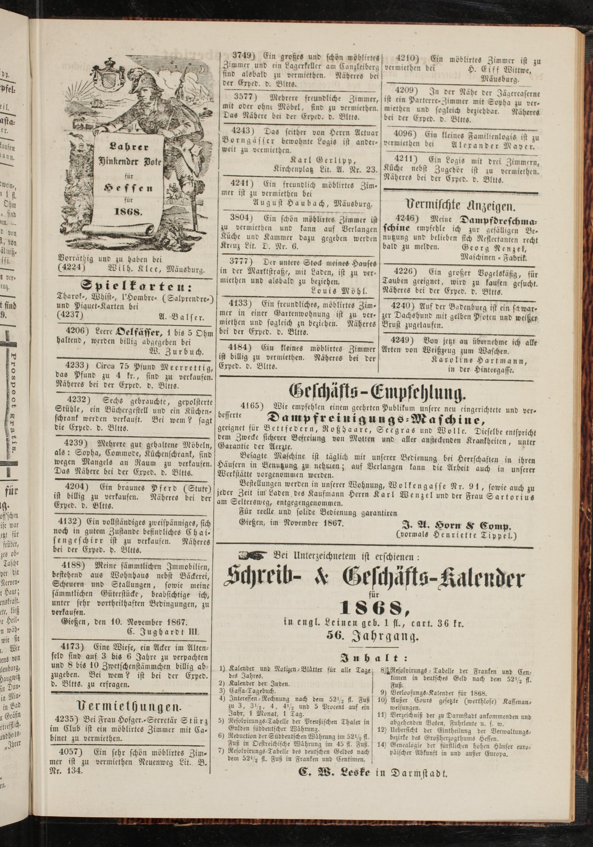 4243) Das seither von Herrn Aetuar Borngässer bewohnte LvgiS ist ander- weit zu vermiethen.