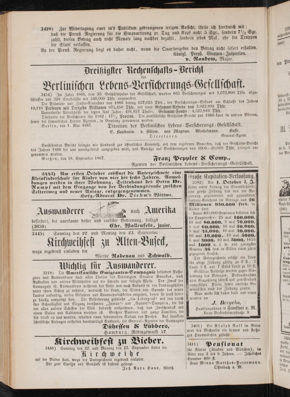 3434) Im Jahre 1866, fern 30. Geschäftsjahre der Gesellschaft, wurden 663 Versicherungen mit i,073,800 Thlr. abgeschlossen und 328 Sterbefälle mit 348,000 Thlr. angemeltet. q ..