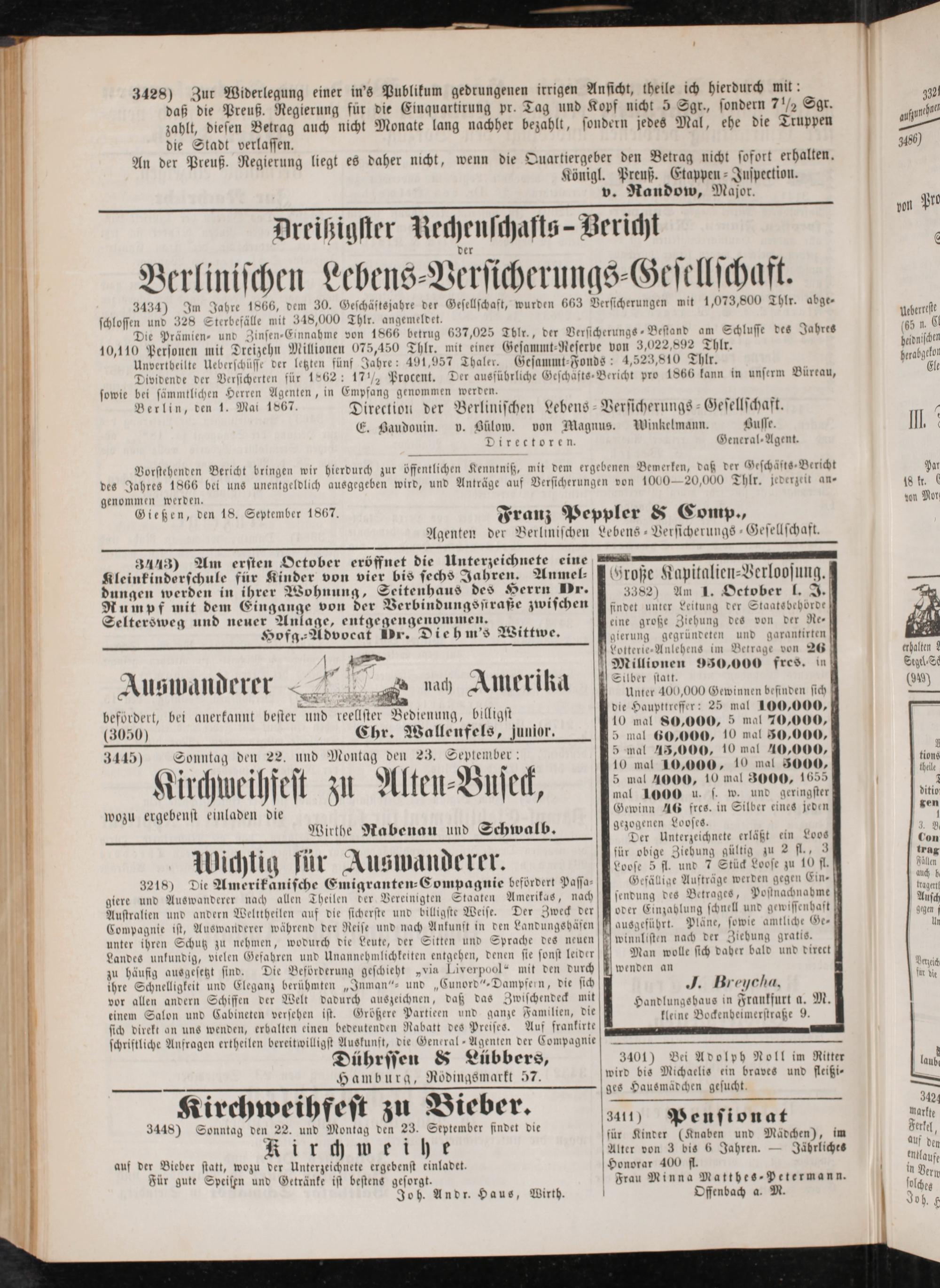 Berlin, een i. Ma, 1867. Direktion der Berlinischen Lebens-Versicherungs-Geikllfmast.